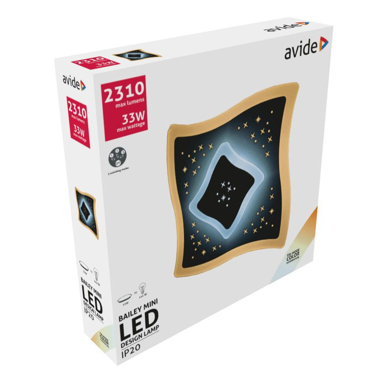LED svietidlo, ktoré je možné namontovať na bočnú stenu aj na strop. Má zabudovaný SMD LED svetelný zdroj s výkonom 33 Wattov. Jej svetelný tok je 2310 lumenov, čo znamená energetickú účinnosť ~80 lumenov/Watt , teda jej spotreba energie zodpovedá jasu klasickej žiarovky s výkonom 100 Wattov. Pri stropnom svietidle si môžete vybrať z 3 režimov svietenia, v prvom a druhom režime môžete použiť kombináciu teplej bielej a studenej bielej LED na dosiahnutie rôznych svetelných efektov, v treťom režime môžete použiť kombináciu teplých biele a studené biele LED diódy na vytvorenie prirodzenej teploty bielej farby.