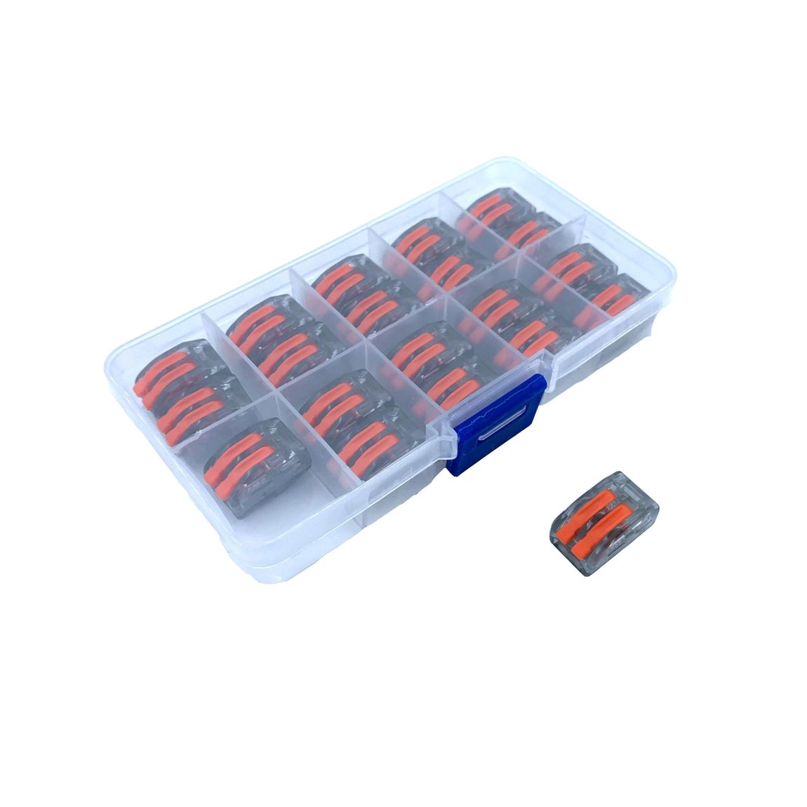 BOX svoriek pre káble – dvojpólové, 20ks, transparentné. Testované v zhode s EN 60998 normou. Terminál (spojka) bez skrutiek pre spájanie elektrických káblov. Spájaný kábel môže byť potenciálny tuhý alebo ohybný. Svorka slúži na rýchle spojenie dvoch pevných vodičov.