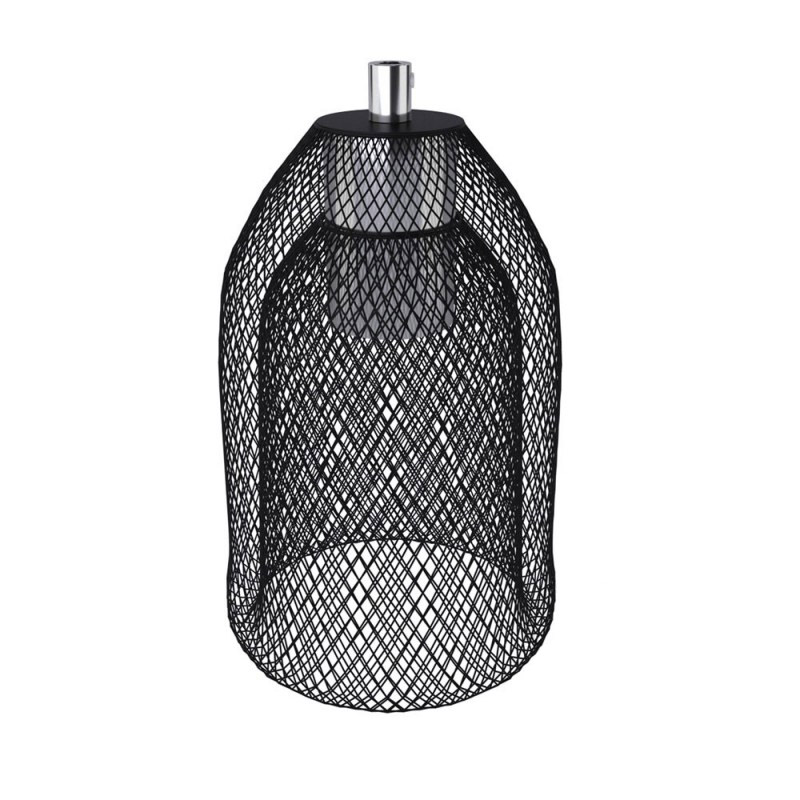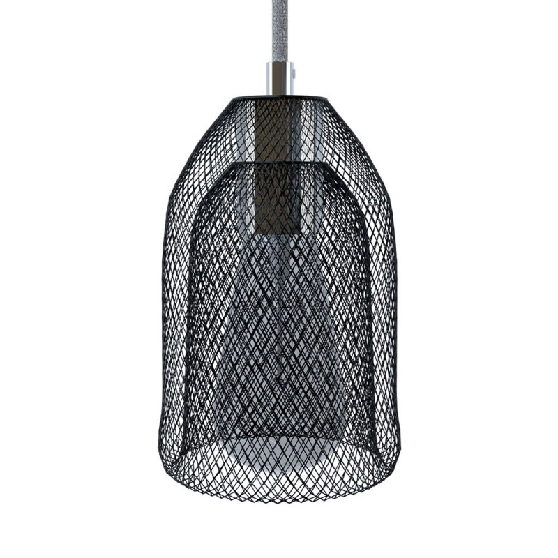 Čierne kovové klietkové tienidlo s chrómovanou kovovou E27 objímkou predstavuje prekvapujúce a elegantné riešenie na zostavenie viacnásobných závesných svietidiel s použitím dekoratívnych LED žiaroviek v tvare Edison ST64 a jednej zo 150 farieb textilných káblov z našej ponuky.