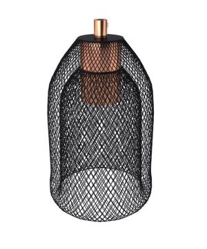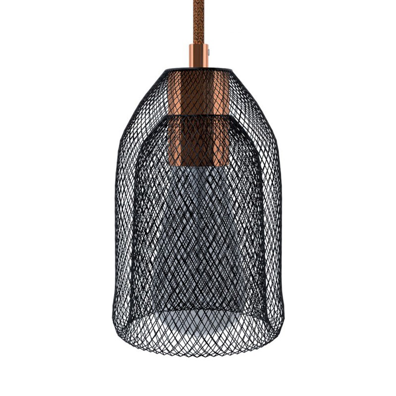 Čierne kovové klietkové tienidlo s medenou kovovou E27 objímkou predstavuje prekvapujúce a elegantné riešenie na zostavenie viacnásobných závesných svietidiel s použitím dekoratívnych LED žiaroviek v tvare Edison ST64 a jednej zo 150 farieb textilných káblov z našej ponuky.