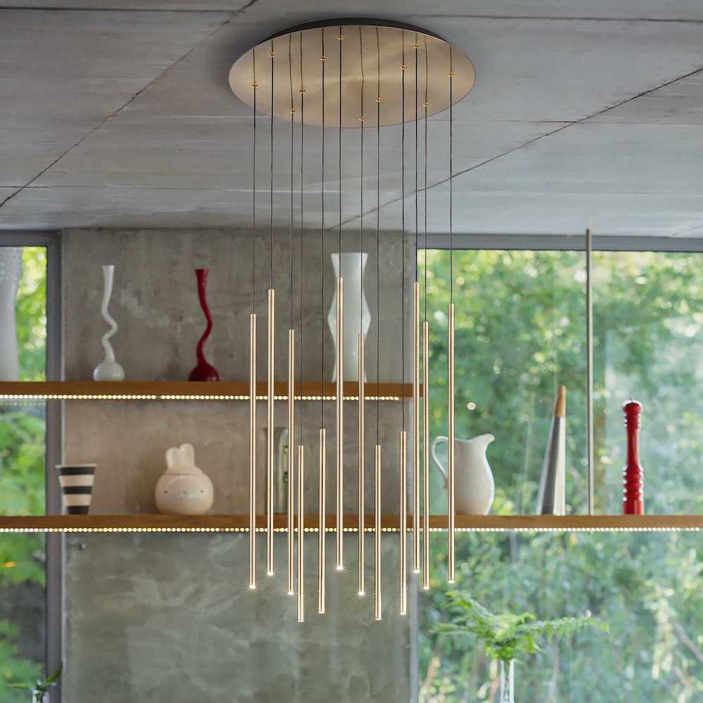 Dizajnový závesný luster FILO SP12 má kovovú rozetu a tienidlá/tyče s práškovým nástrekom alebo pokovovaním. Čierne elektrické vodiče z PVC. Farby: biela, čierna alebo mosadz.