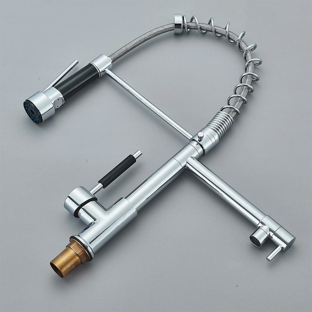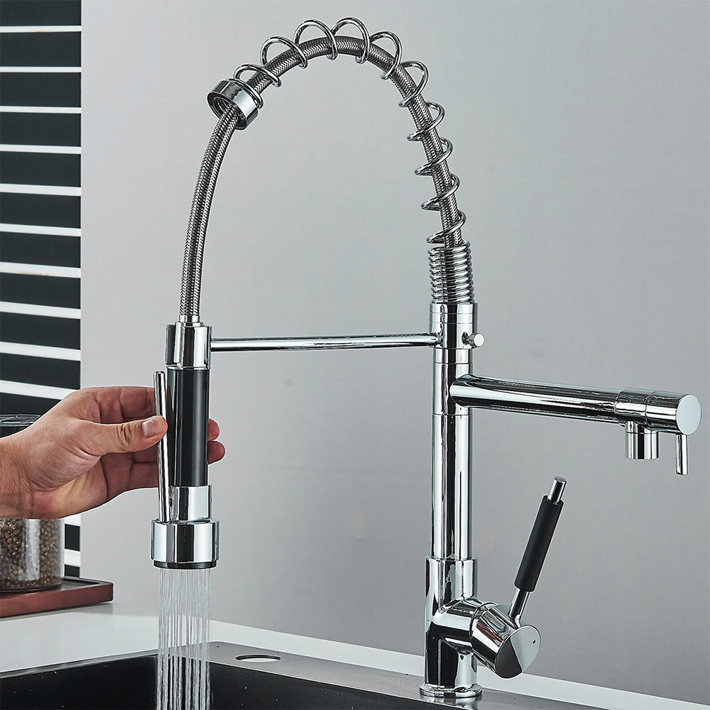 - Kohútik sa dá otáčať o 360°. Obe sprchy možno ovládať nezávisle od seba. Hlavnú sprchu možno pohodlne ovládať tlakom ruky. Vďaka zaveseniu sa dá aj voľne pohybovať. Vďaka dvom sprchám je ideálna pre dve vedľa seba stojace umývadlá.