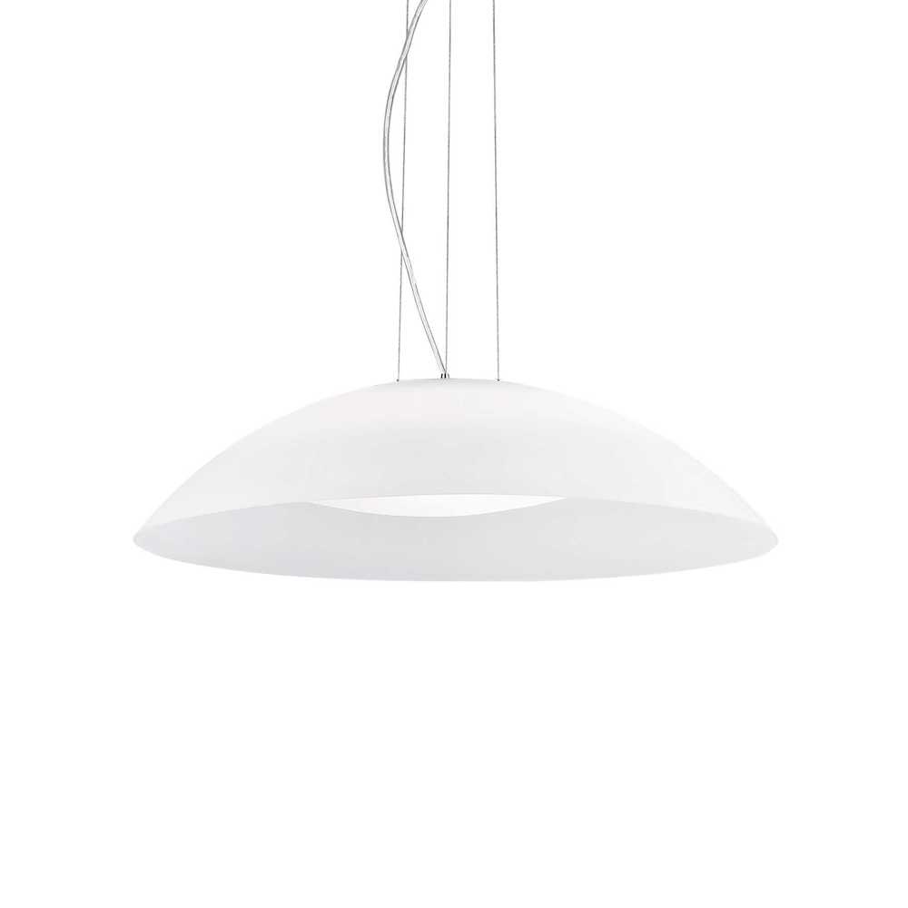 Jednoduchý sklenený závesný luster LENA SP3 D64 s kovovým chrómovým rámom. Dvojité sklenené tienidlo. Vonkajšie tienidlo v matnej bielej, hnedej alebo sivej farbe. Vnútorné tienidlo v bielej farbe.