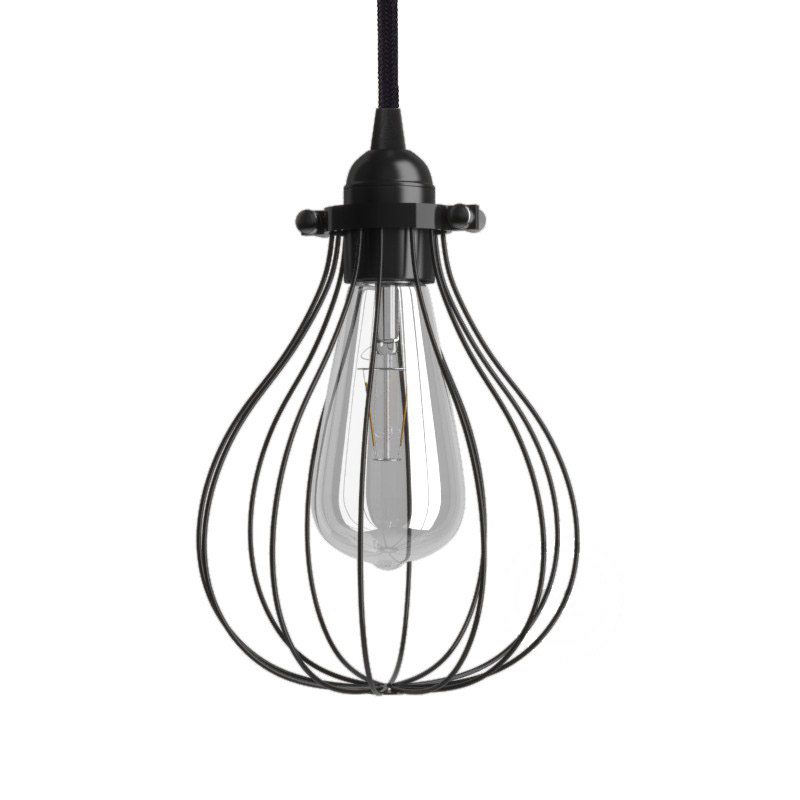 Klietka kovová v tvare kvapky. Klietka kovová na žiarovku v tvare Kvapky je inšpirovaná industriálnou až priemyselnou atmosférou. Prstencová svorka pasuje s každou objímkou a ak sa spojí s jednou z mnohých farieb našich textilných elektrických káblov získate perfektnú závesnú alebo nástennú lampu ktorá sa hodí do akéhokoľvek priestoru – domáceho či verejného.