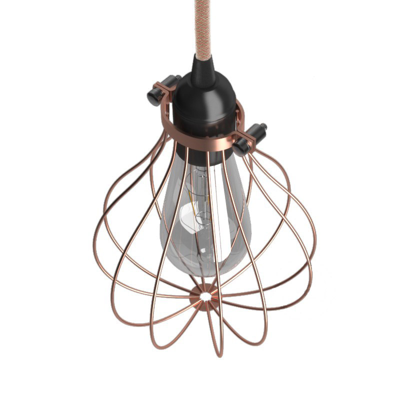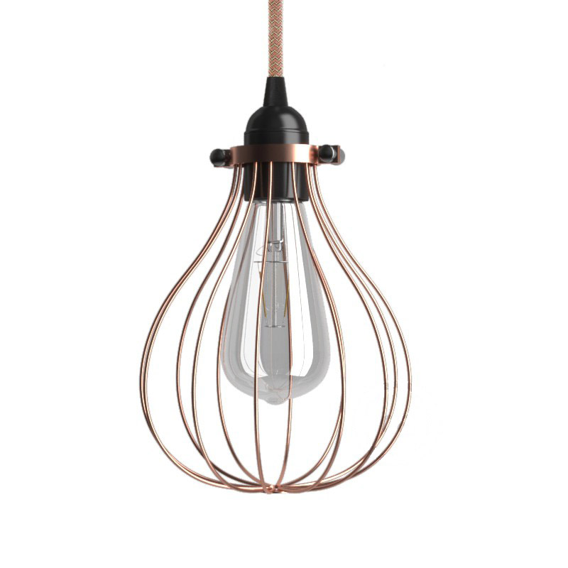 Klietka kovová v tvare kvapky. Klietka kovová na žiarovku v tvare Kvapky je inšpirovaná industriálnou až priemyselnou atmosférou. Prstencová svorka pasuje s každou objímkou a ak sa spojí s jednou z mnohých farieb našich textilných elektrických káblov získate perfektnú závesnú alebo nástennú lampu ktorá sa hodí do akéhokoľvek priestoru – domáceho či verejného.