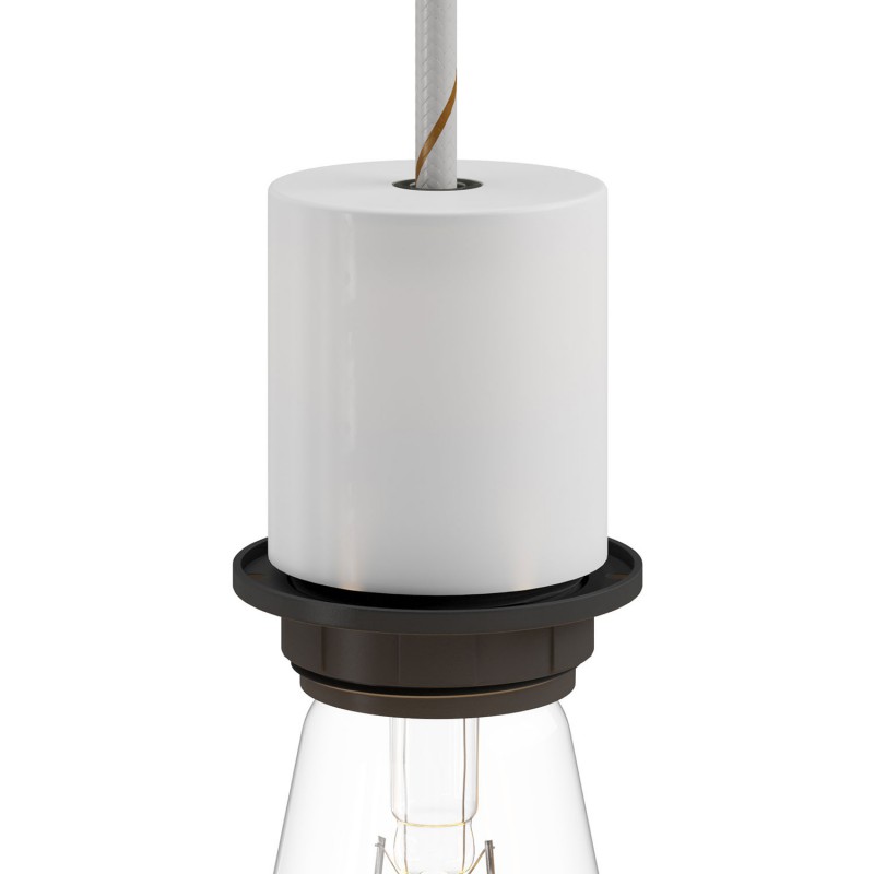 Kovová objímka pre tienidlo so skrytou káblovou svorkou pre žiarovku E27 so skrytou káblovou svorkou slúži na montáž závesného svietidla. Balenie pozostáva z objímky pre žiarovku E27, kovová krytku z kovu a skrytej káblovej svorke. Doplňte svoju inštaláciu osvetlenia komponentami, príslušenstvom, žiarovkami a textilnými káblami z nášho sortimentu. U nás nájdete všetko potrebné na výrobu vlastnej unikátnej lampy.