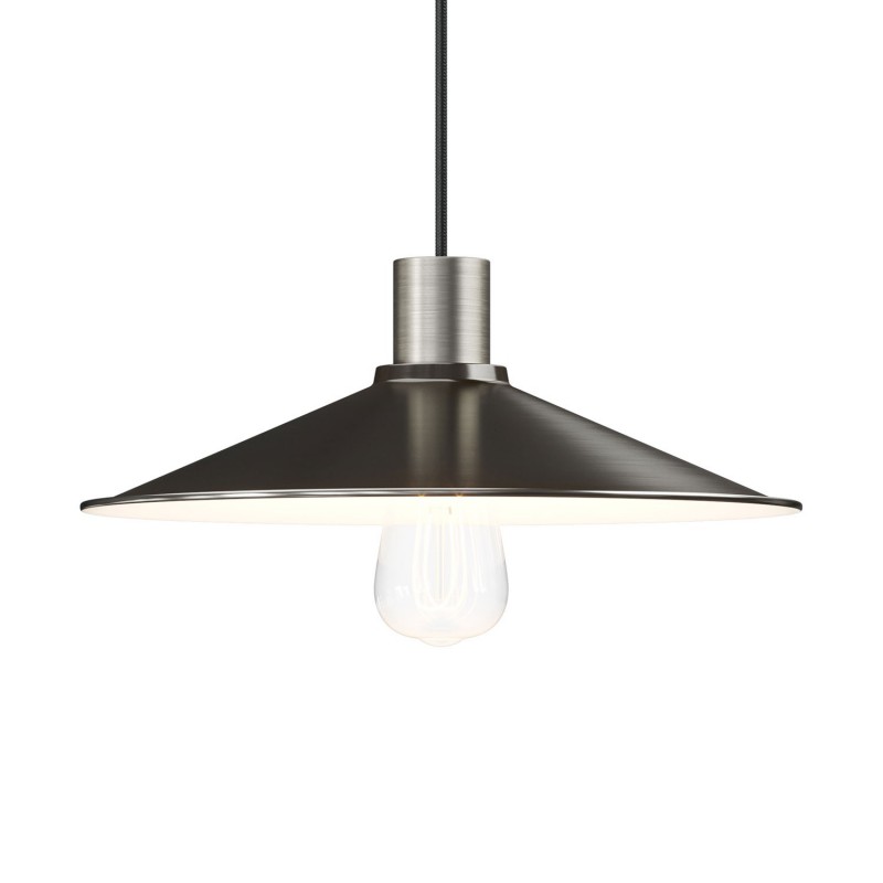 Retro kovové tienidlo v brúsenej titánovej farbe, priemer 30cm. Dokonalé zapadá do podkrovných bytov, reštaurácií alebo hotelov. Dodáva ideálny nádych farby k čiernym a bielym stenám. Tvar tienidla je minimalistický, takže nebude svojou farbou kaziť vzhľad, ale pritiahne oko každého zvedavca. Vďaka svojmu ikonickému a veľmi jednoduchému tvaru je toto tienidlo ideálne na použitie vo veľmi svetlých interiéroch, ako sú kuchyne a verejné priestory.