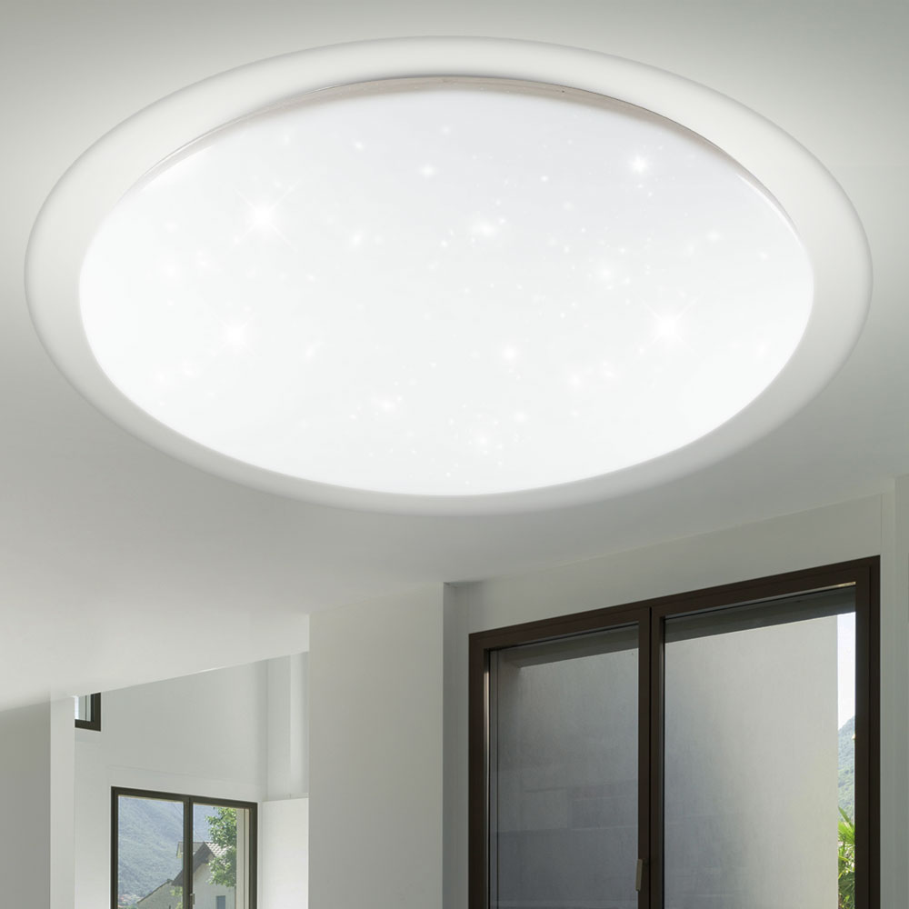 Kruhové LED stropné svietidlo 40W, Stmievateľné, 3 farby, Aplikácia, 2800lm, 46cm, Stary. Okrúhly tvar so zadnou časťou z kovového a bieleho plastového krytu. Kryt je vyrobený s nepravidelným bodovým obrazom, ktorý vám umožňuje simulovať efekt hviezdnej oblohy. Svetelný lúč 120 ° a svetelný tok až 2800lm.