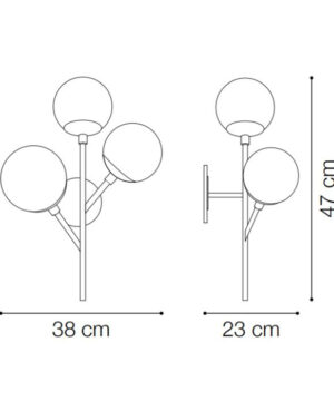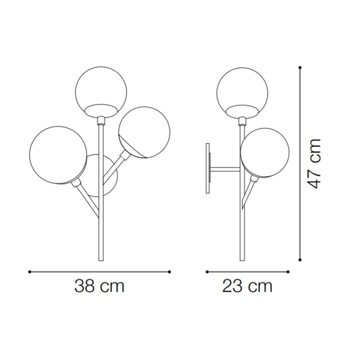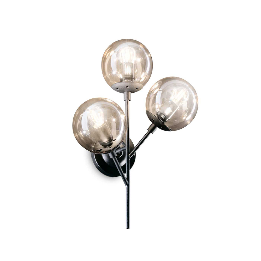 Netradičná Lampa nástenná KEPLER z kolekcie interiérového osvetlenia Ideal Lux v zaujímavom retro dizajne vhodne nasvietí obývacie priestory ideálne v modernom alebo klasickom interiéri. Rám svetla je kovový s matnou čiernou povrchovou úpravou. Ako vznášajúce sa bubliny z bublifuku vyzerajú tienidlá z fúkaného skla s jemným nádychom svetlo oranžovej farby. Nástenné svietidlo je osadené päticami E27 s maximálnym príkonom 3 x 40 W. Žiarovky nie sú súčasťou balenia. Odporúčame zvoliť LED žiarovky typu LED, ktoré znižujú náklady na elektrickú energiu a majú extrémne dlhú životnosť. Krytie IP20 je vhodné na použitie do interiéru.