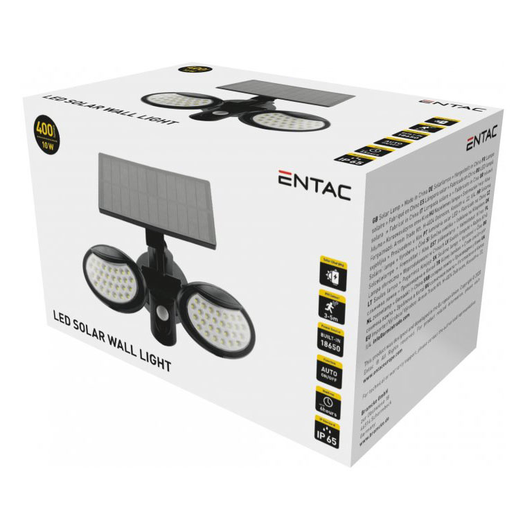 LED nástenné solárne svietidlo s pohybovým senzorom, 10W, IP65, 400lm, ideálne pre umiestnenie nad vchodové dvere, pre osvetlenie záhrady, jazierok, terasy alebo chodníkov. Svietidlo sa nabíja behom dňa a po zotmení sa automaticky zapne pri zachytení pohybu.