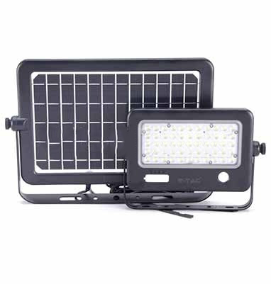 LED solárne svietidlo s odnímateľným solárnym panelom s výkonom 10 W denného bieleho svetla 4000K, vybavený solárnym panelom, internou lítiovou batériou a integrovaným snímačom pohybu. Vyrobené z hliníka a vysoko pevného čierneho plastu s priehľadným sklom. LED svetlo je vybavené nabíjateľnou lítiovou batériou (7200 mAh) a solárnym panelom, ktoré zaručujú dosah až 24 hodín (čas nabíjania 6-7 hodín). Nabíjanie sa môže uskutočňovať cez port Micro USB alebo cez samostatný solárny panel s káblom dlhým 3 metre.
