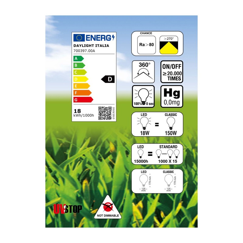 V našich žiarovkách značky Daylight Italia sa stretáva starodávna atmosféra starých žiaroviek s efektívnou spotrebou a dlhou životnosťou moderných LED žiaroviek. Tieto žiarovky spotrebujú len desatinu energie v porovnaní s EDISON modelmi s uhlíkovým vláknom a ich životnosť je až 8x dlhšia. Glóbusové žiarovky v tvare gule sú ideálne pre spojenie s našimi textilnými káblami a komponentami.