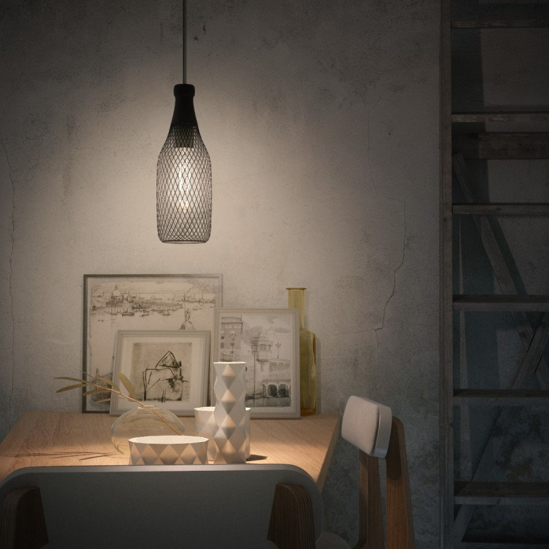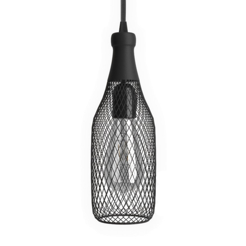 Moderná Klietka kovová v tvare fľaše, čierna farba. Dokonalé zapadá do moderných bytov, reštaurácií alebo hotelov. Dodáva ideálny nádych farby k čiernym a bielym stenám. Tvar tienidla je minimalistický, takže nebude svojou farbou kaziť vzhľad, ale pritiahne oko každého zvedavca.