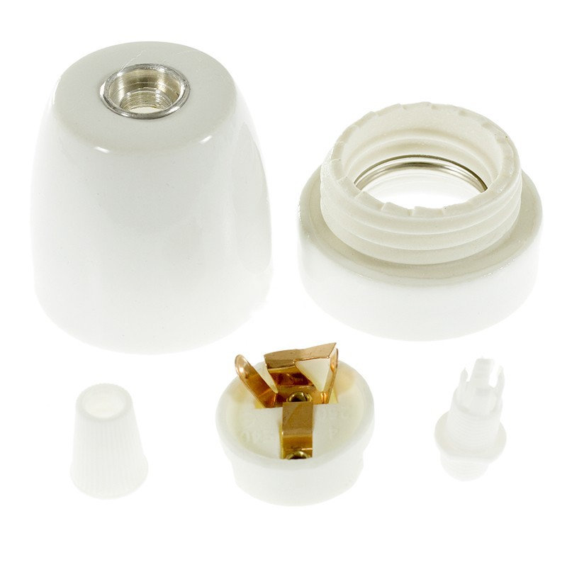Porcelánové kvalitné objímky v elegantnom štýle pre žiarovky s päticou E27. Vybavená skrutkou pre zabránenie vytiahnutia kábla zo zásuvky. Kompatibilná so všetkými žiarovkami s päticami E27, káblami ( okrem lanových káblov) a príslušenstvom z nášho sortimentu.