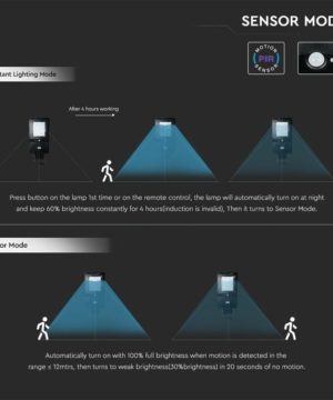 stlačte tlačidlo na lampe alebo na diaľkovom ovládači, lampa sa automaticky zapne so 100% plným jasom, keď je detekovaný pohyb v rozsahu ≤ 12 m, potom sa zapne na 30% jas za 20 sekúnd bez pohybu.