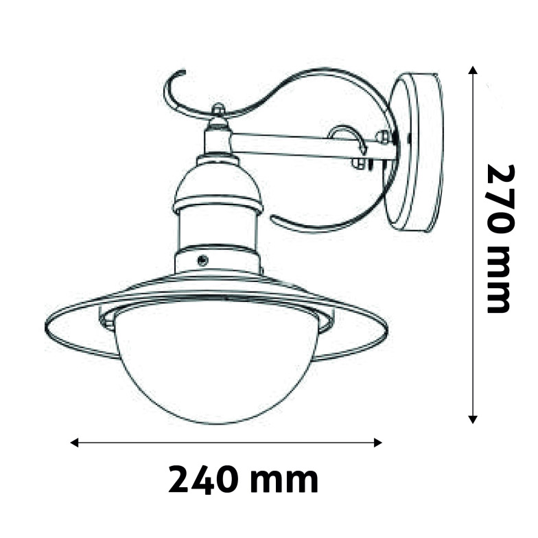 Prémiové vonkajšie nástenné svietidlo na 1 žiarovku s veľkým závitom E27 o príkone max 20W, fungujúce na napätí 220-240V. Toto vonkajšie svietidlo v tvare starožitnej lucerny je perfektným riešením pre osvetlenie vchodu do domu, pergoly, terasy, apod. Jedná sa o kvalitné vonkajšie svietidlo ktorého robustné telo je vyrobené z kvalitného kovu, ktorý nehrdzavie. Narozdiel od lacných plastových vonkajších nástenných svietidiel, ktoré pôsobením vonkajších podmienok, najmä slnečného žiarenia, postupne krehnú, menia farbu a rozpadajú sa, toto sa Vám s tým naším naozaj nestane. Kryt žiarovky je vyrobený z plastu, ktorý je odolnejší proti prasknutiu, než sklo. Kryt rozptyľuje svetlo najmä smerom nadol, čiastočne aj do strán.