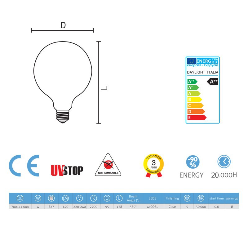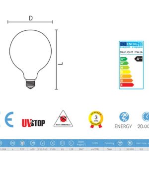 V našich žiarovkách značky Daylight Italia sa stretáva starodávna atmosféra starých žiaroviek s efektívnou spotrebou a dlhou životnosťou moderných LED žiaroviek. Tieto žiarovky spotrebujú len desatinu energie v porovnaní s EDISON modelmi s uhlíkovým vláknom a ich životnosť je až 8x dlhšia. Glóbusové žiarovky v tvare gule sú ideálne pre spojenie s našimi textilnými káblami a komponentami.