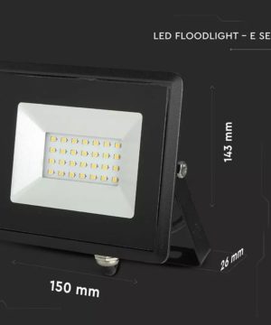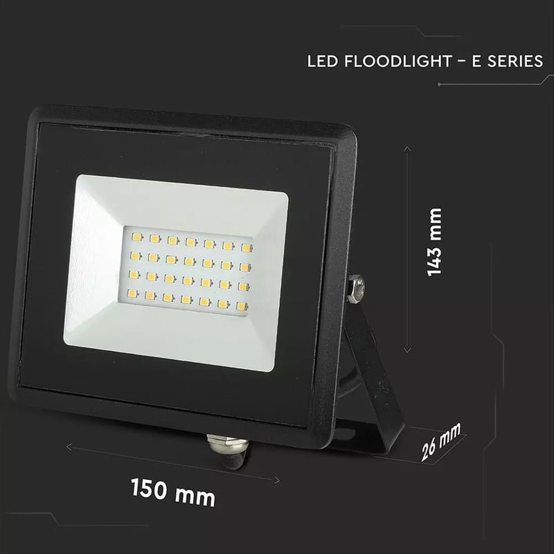 Reflektor LED E-Series 20W, Denná biela, 4000K, 1700lm, čierny. Ultra tenká konštrukcia z tlakovo liateho hliníka v bielej farbe má kryt z priehľadného skla SMD. Tenký dizajn ho robí ľahším ako bežný maják a ľahšie sa inštaluje na stenu (dodáva sa s držiakom na upevnenie). Okrem toho je odolný voči vode (IP65 & IK06), a preto môže byť inštalovaný aj vo vonkajších priestoroch, ako sú záhrady, dvory, vily atď. Skvelý vo video monitorovacích a bezpečnostných systémoch, vzhľadom na nízku absorpciu môže byť ponechaný nepretržite.