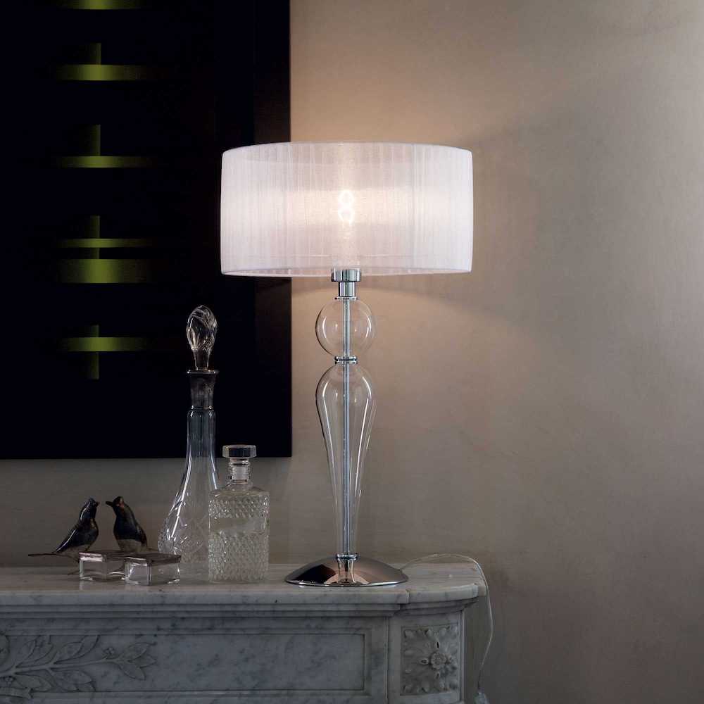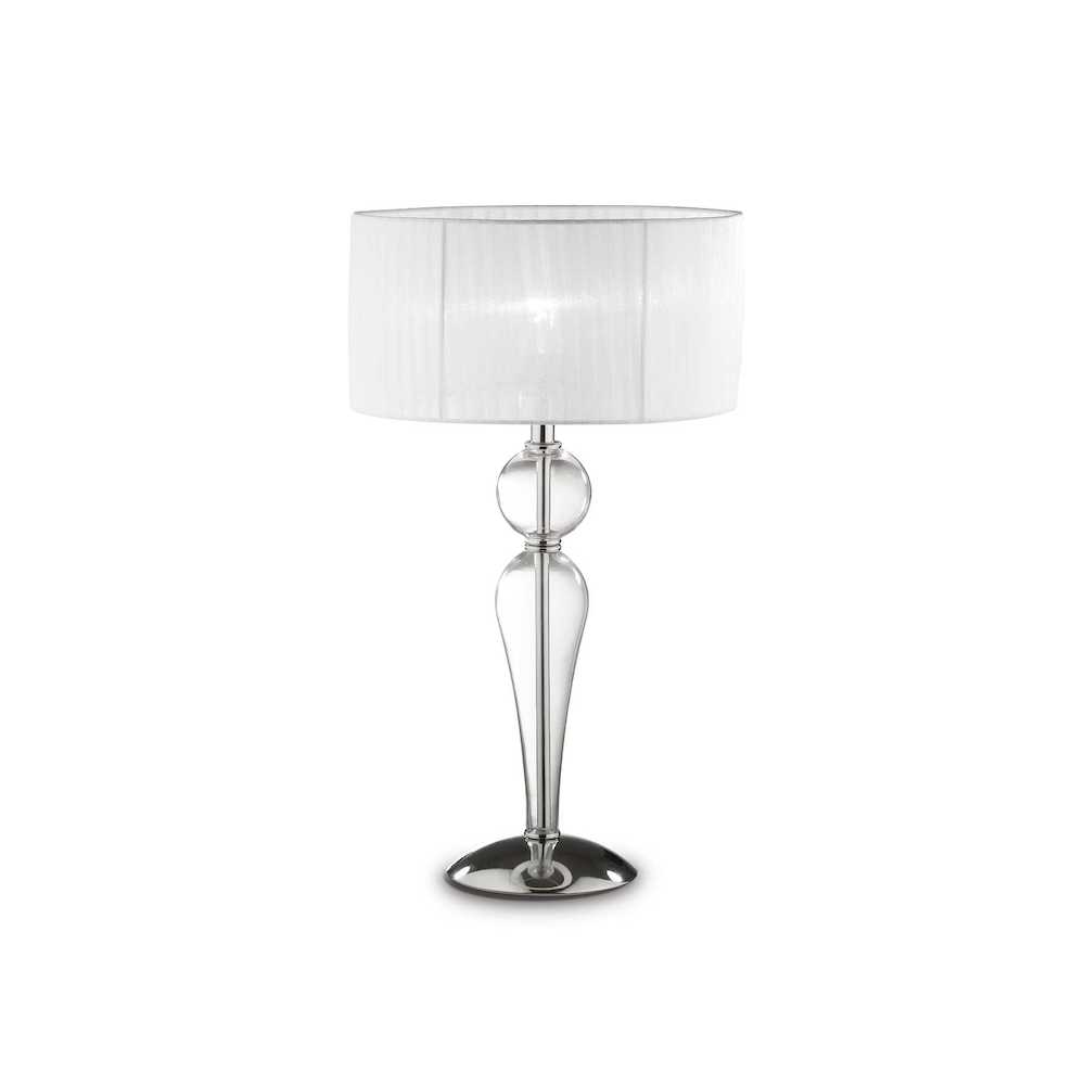 Stolová lampa DUCHESSA TL1 BIG, chrómový kovový podstavec z fúkaných a ručne dokončovaných sklenených prvkov. Tienidlo vyrobené z plisovanej látky. Napájací kábel s integrovaným vypínačom. Táto lampa je vhodná nie len ako svietidlo ktoré ma osvetliť priestor ktorý potrebujete ale aj ako dekorácia na stôl či stolík, ktorá určite zaujme.