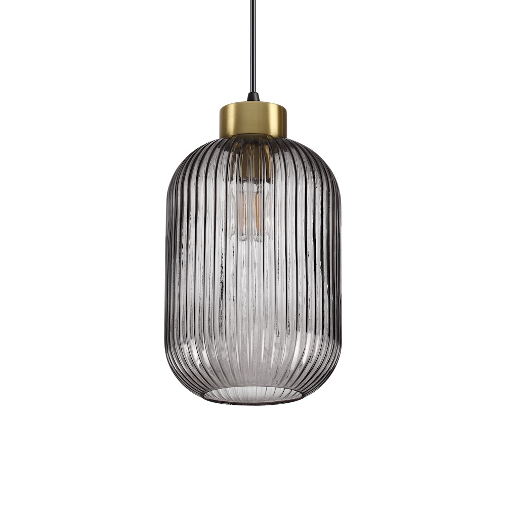 Sklenené svietidlo MINT-3 SP1 SMOKY GREY. Kovový rám s matnou mosadznou povrchovou úpravou a matnou čiernou stropnou rozetou. Silový kábel potiahnutý tkaninou. Fúkané sklenené tienidlo s reliéfnymi pruhmi. Dostupné povrchové úpravy: SMOKY GRAY a GREEN.