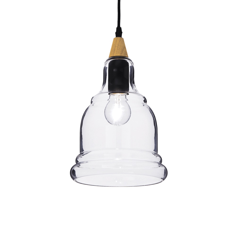 Sklenené závesné svietidlo GRETEL SP1. Gretel je luster v štýle vintage, ktorý sa vyznačuje kovovou štruktúrou zakončenou matnou čiernou farbou s aplikáciou prírodného dreva, priehľadným tienidlom z fúkaného skla a elektrickými káblami z čiernej tkaniny. Gretel je dodávaný v troch rôznych modeloch s jedným zvonovým difúzorom alebo v modeloch s viacerými difúzormi. Tieto sú k dispozícii vo variante štyroch difúzorov rôznych tvarov a s obdĺžnikovou rozetou alebo piatich difúzorov s okrúhlou rozetou. Gratel je závesná lampa ideálna na osvetlenie rôznych prostredí, ako je kuchyňa alebo obývacia izba.