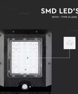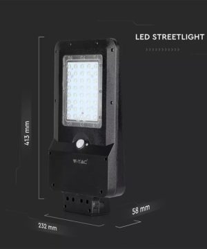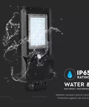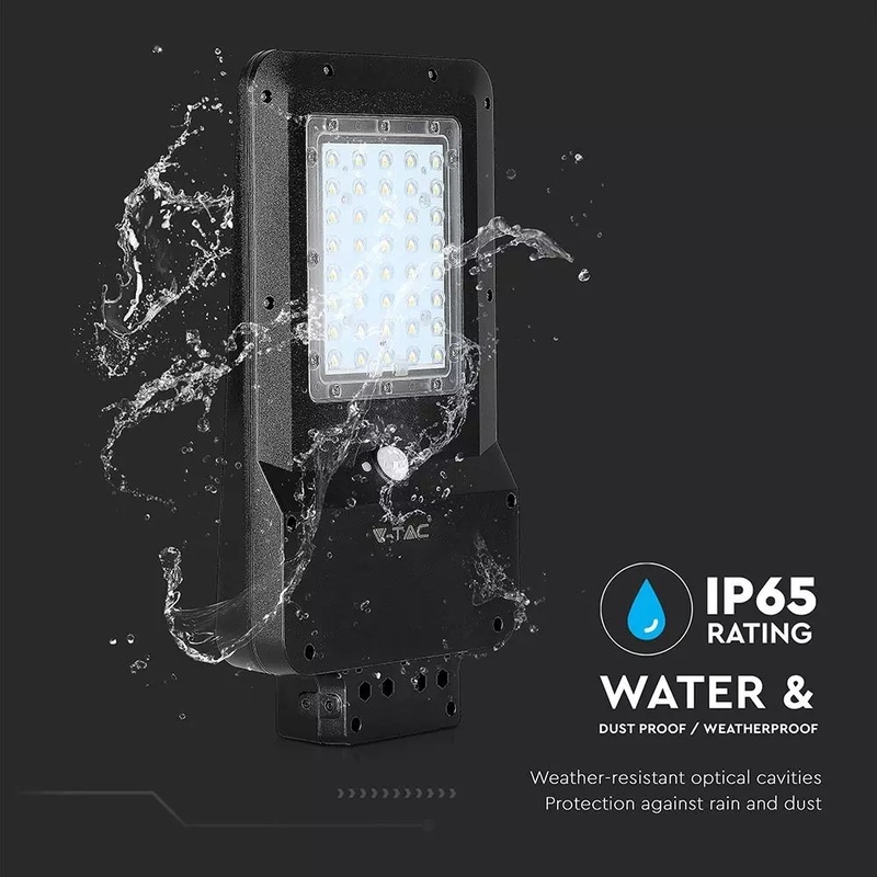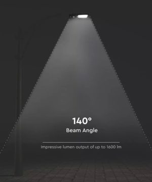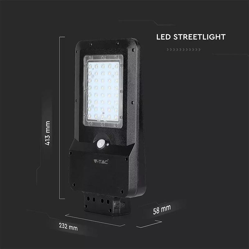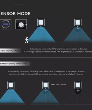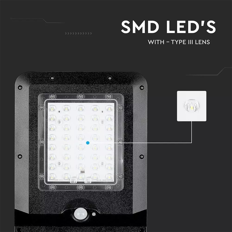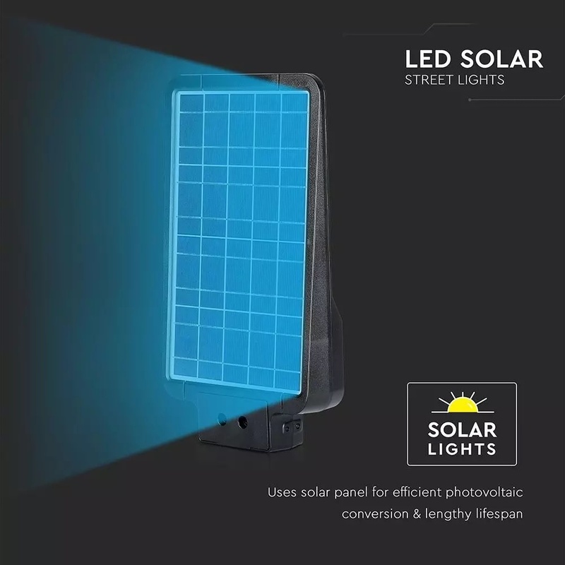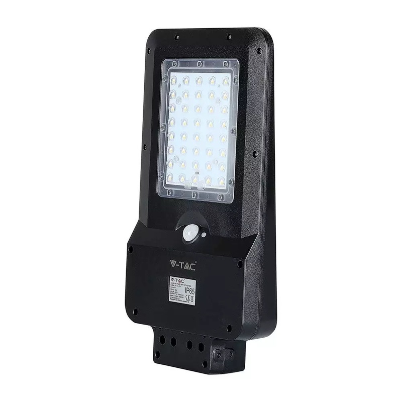 15W pouličné LED svetlo so solárnym panelom, senzorom súmraku a senzorom pohybu. Telo z čierneho plastu s moderným ultra tenkým dizajnom. Studené biele svetlo farebného odtieňa 6000K, so svetelným lúčom 140° a svetelným tokom s vysokou svietivosťou 1600LM. Lampa má mini solárny panel, ktorý vám umožňuje napájať 7,4V 10,800MAH lítiovú dobíjaciu batériu, ktorá sa nachádza vo vnútri lampy. Batéria má prevádzkovú autonómiu približne 12/15h. Dobíjanie prebieha pomocou solárnej energie, ktorá už za 6/7h umožňuje dobiť stav batérie na maximum. Svietidlo sa aktivuje stlačením tlačidla v hornej časti tela svietidla. Navyše, vďaka vstavanému PIR detektoru je možné naprogramovať produkt podľa rôznych typov prevádzkových režimov:
