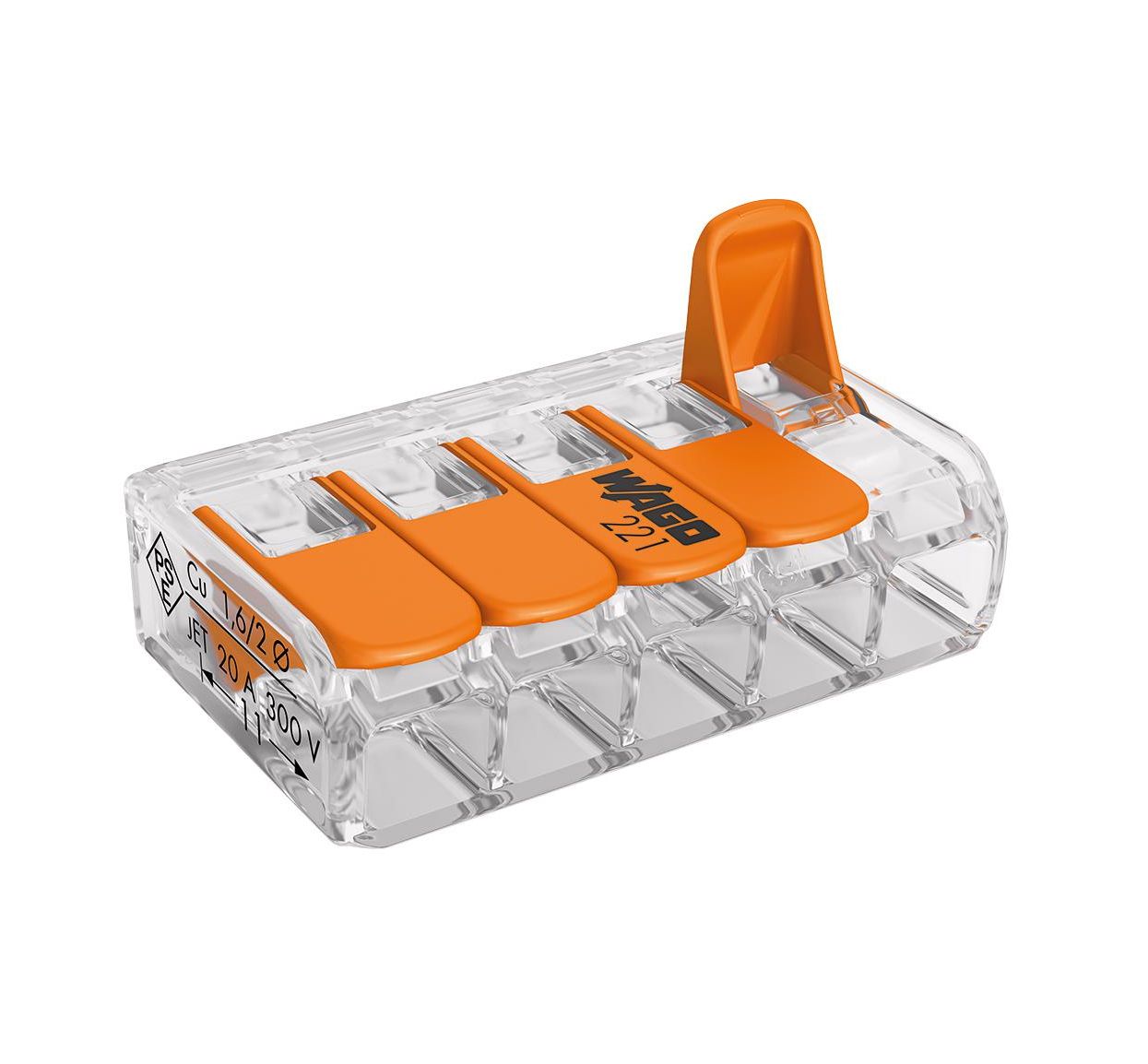 Svorka WAGO – pätpólová. Testované v zhode s EN 60998 normou. Terminál (spojka) bez skrutiek pre spájanie elektrických káblov. Spájaný kábel môže byť potenciálny tuhý alebo ohybný. Svorka slúži na rýchle spojenie dvoch pevných vodičov.
