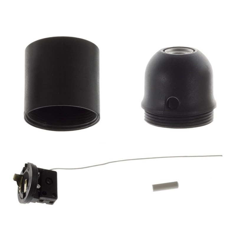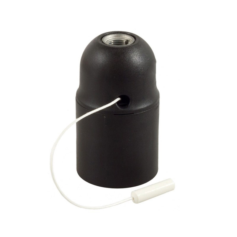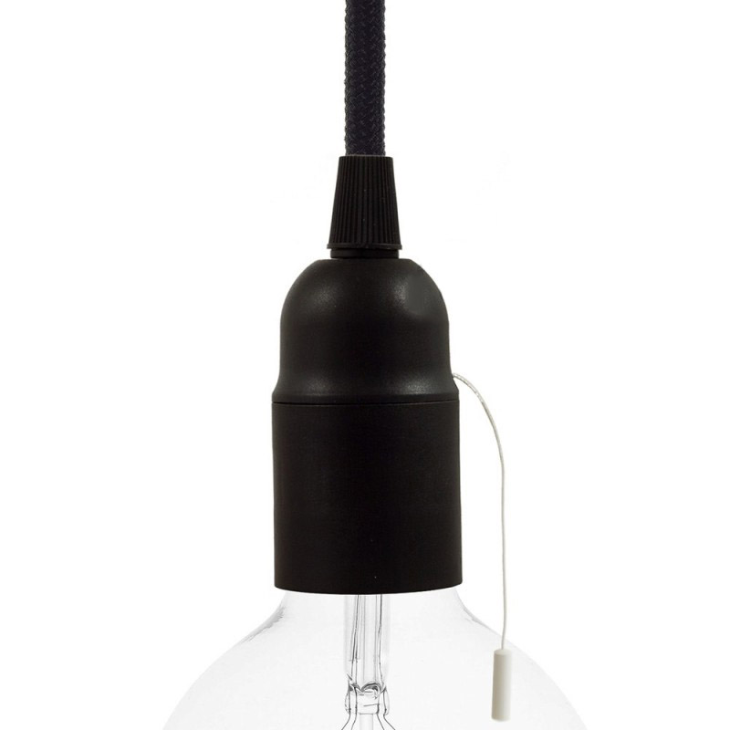 Termoplastová objímka E27 s ťahacím vypínačom v čiernej farbe. Vypínač umožňuje zapínanie a vypínanie svetla priamo na objímke, vďaka čomu z nej môžete vyrobiť závesnú alebo stolnú lampu s vlastným spínačom. Vyrobená v Taliansku a je certifikovaná v súlade s najprísnejšími európskymi normami (IMQ-ENEC).