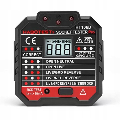 LED indikátor v hornej časti jednotky vás upozorní, ak sa vyskytnú nejaké problémy. Ak tester zaznamená akúkoľvek abnormalitu, LED diódy sa rozsvietia v špecifickej kombinácii. Takto rýchlo zistíte napríklad prevrátenie plus/mínus káblov, chýbajúce uzemnenie alebo chýbajúci nulový kábel. Pomocou HT106D môžete tiež vykonať jednoduchý test RCD.