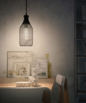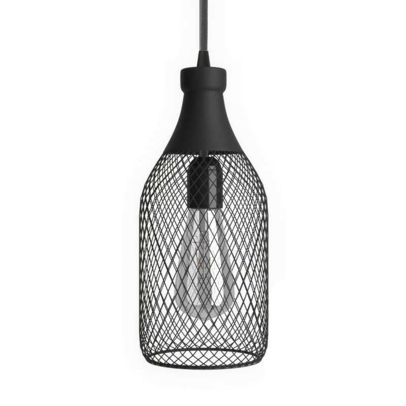 Luster určený pre milovníkov industriálneho štýlu a klietkových tienidiel. Táto závesná lampa je ideálna na dodanie originálneho nádychu do vašich izieb: monochromatické povrchové úpravy sú ideálne na opätovné vytvorenie moderného štýlu s minimálnym dotykom , zatiaľ čo vďaka fľašovému tvaru tienidla s kovovou klietkou môžete vytvoriť teplú a príjemnú atmosféru. atmosféru s nádychom originality. Odporúčame vám použiť toto stropné svietidlo na osvetlenie vašich spoločenských interiérov, ako je jedáleň alebo kuchynský ostrovček.