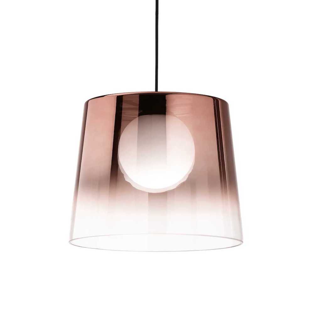 Kovová stropná rozeta a rám. Číre tienidlo z fúkaného skla s galvanickým odtieňom. Vnútorný difúzor z bieleho fúkaného skla leptaného kyselinou. Čierny PVC kábel. Dostupné v týchto odtieňom tienidla: číra s jantárovým odtieňom, chróm alebo meď.